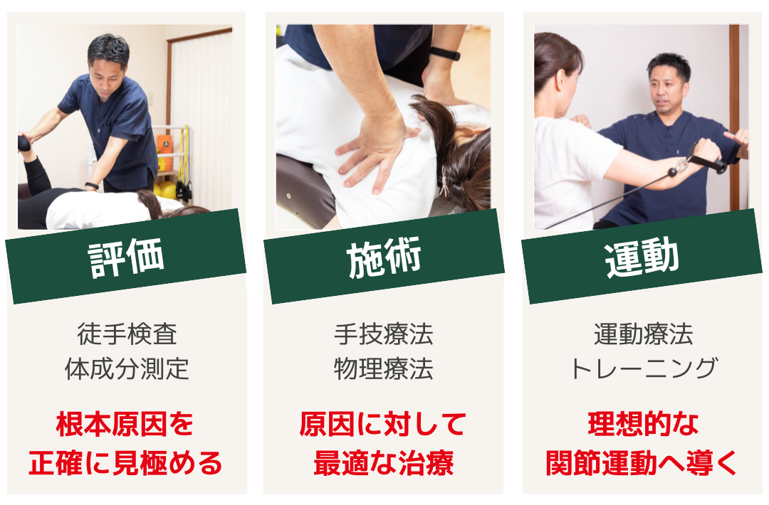 そのために私たちは、「評価」「施術」「運動」の3つのステップを大切にしています。